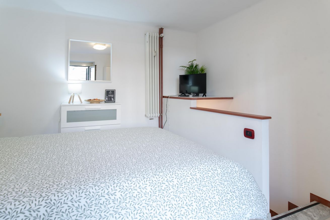 La zona notte è soppalcata, composta da letto matrimoniale; in aggiunta è presente un armadio e una cassettiera. La TV si trova nella zona notte.